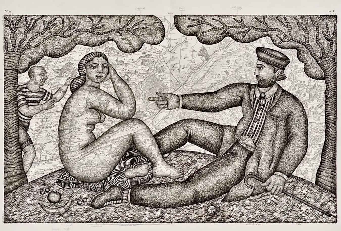 Clara Castagné cabotine de l’art aime détourner ses personnages d’une réalité conceptuelle. En abordant une calligraphie qui se trace sur les méandres de la carte de géographie, la dessinatrice explore la matière papier par le biais d’une forme féminine en portrait, ou entière qui couvre une partie des motifs d’une péninsule ou d’une cartographie de ville.