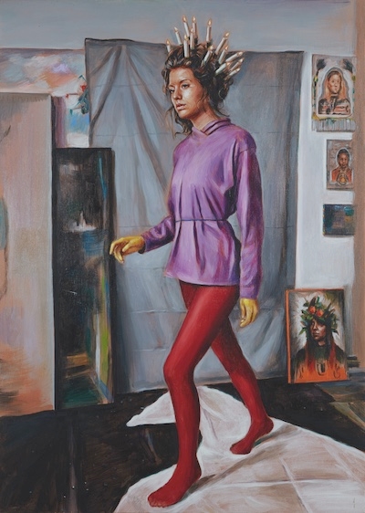 Elle est peinte et les objets qu’elle contient relèvent aussi de la peinture. Autant d’indices qui s’assemblent quand plus loin la peinture se réalise sur des étendards comme une allusion à une cérémonie processionnelle. Sur des toiles ou sur le sol, des étoffes, des boites, des représentations de tableaux et toujours l’inscription du temps, l’histoire de l’art qui se confond à celle des êtres chers. Florence Obrecht installe l’imaginaire au cœur du réel et le quotidien s’élève à la dimension d’un mythe quand les personnages empruntés à la peinture de la Renaissance revisitée par le Surréalisme sont des icônes silencieuses hors du temps.