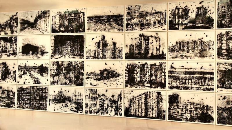 Trente deux dessins réalisés avec des morceaux de fusain disposés et écrasés sur le papier