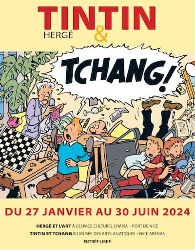 « Tintin, Hergé & Tchang », une double exposition sur les traces des aventures de Tintin à voir du 27 janvier au 30 juin 2024 dans deux lieux culturels d'exception de la ville de Nice, gratuits et ouverts à tous, l'espace culturel Lympia et le musée départemental des arts asiatiques.