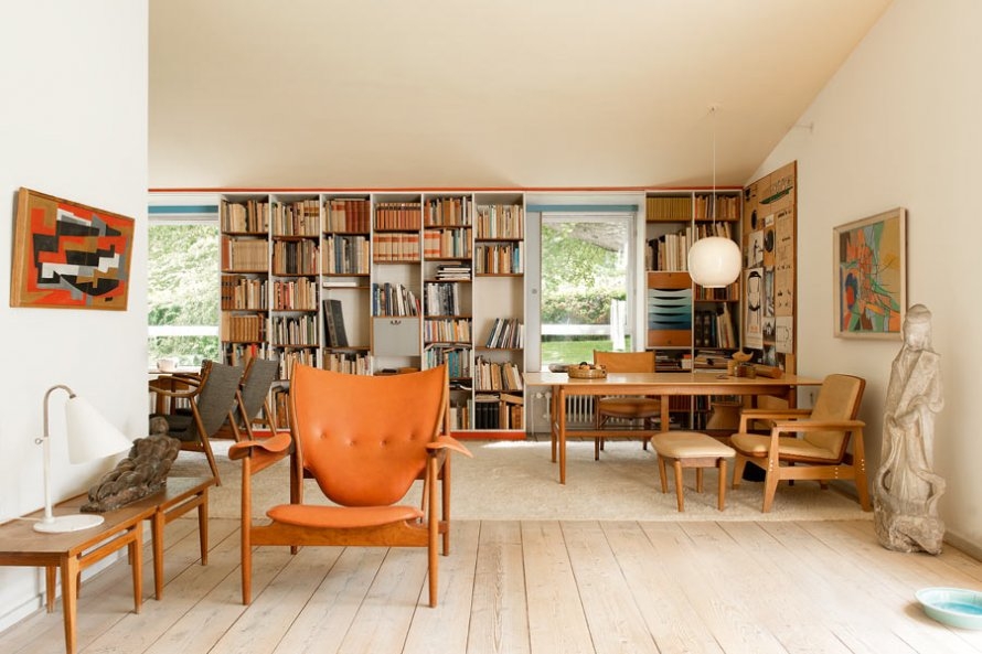 Finn Juhl a dessiné la plupart des meubles de ce grand salon scandinave avec un espace dédié au bureau. Au premier plan, la célèbre "Chieftain Chair" en cuir orange inspirée par des statuettes guerrières avec lance et bouclier réchauffe la pièce. Au fond, l'espace bureau est composé d'un rayonnage mural "Bookcase" (1942), de la table "Drawing Board" (1950) et du "Chair" et son ottoman (1953). Toujours dans les mêmes tons chauds, Finn Juhl a choisi un tableau de Jean Deyrolle (Thona, 1952) à gauche et, à droite, un tableau de Richard Mortensen (Opus 5, nà 4. Gamla Staden, 1948). En bref, un espace à l'atmosphère sereine et claire où création rime avec réflexion.