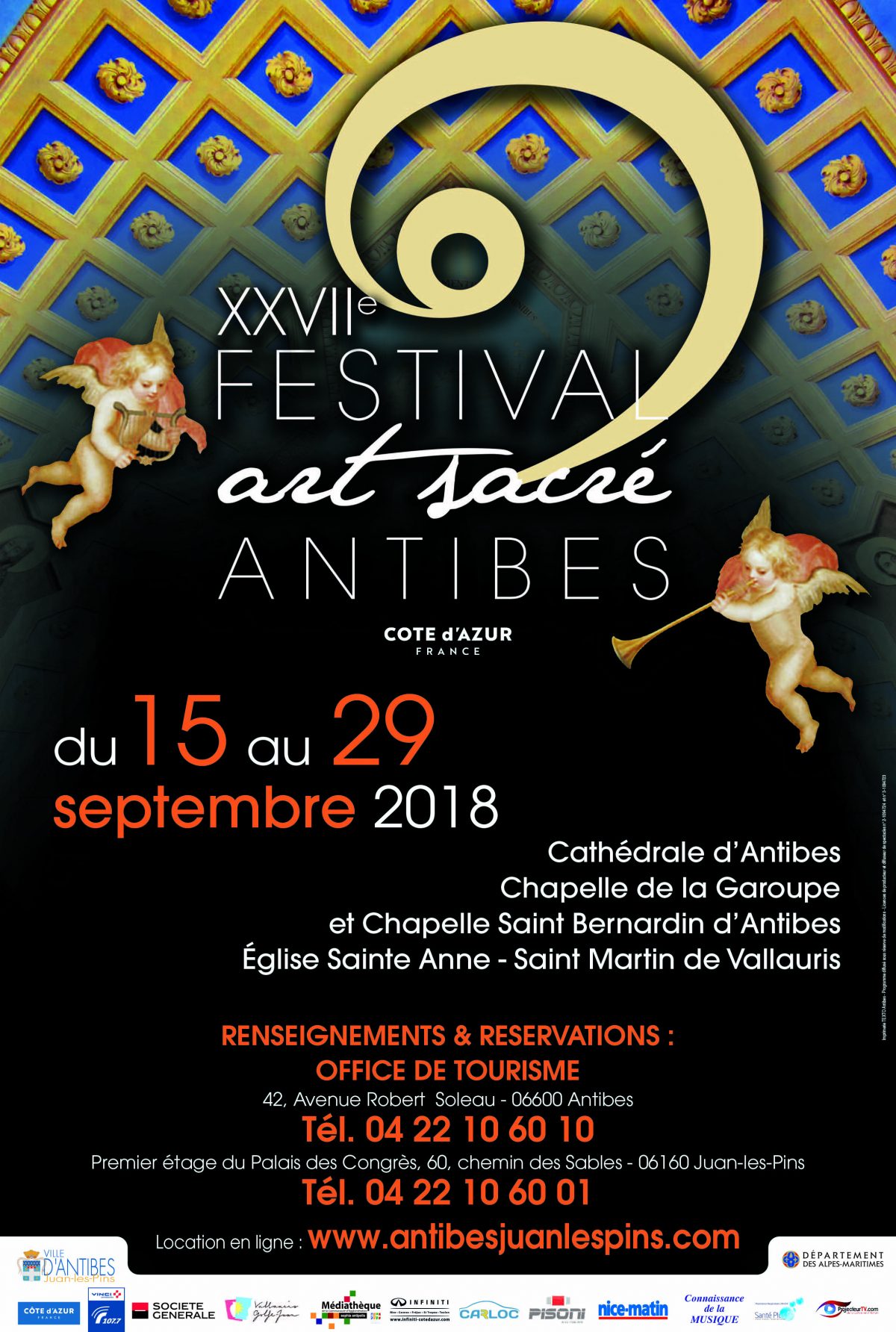 La XXVIIème édition du Festival d’art sacré d’Antibes se déroulera du 15 au 29 septembre 2018. Elle mettra en valeur les lieux emblématiques du patrimoine de la ville d’Antibes Juan-les-Pins. Depuis la création de cet événement, orchestres, choeurs et solistes de réputation internationale sont au service de quelques-unes des plus belles pages du répertoire de la musique sacrée et profane.