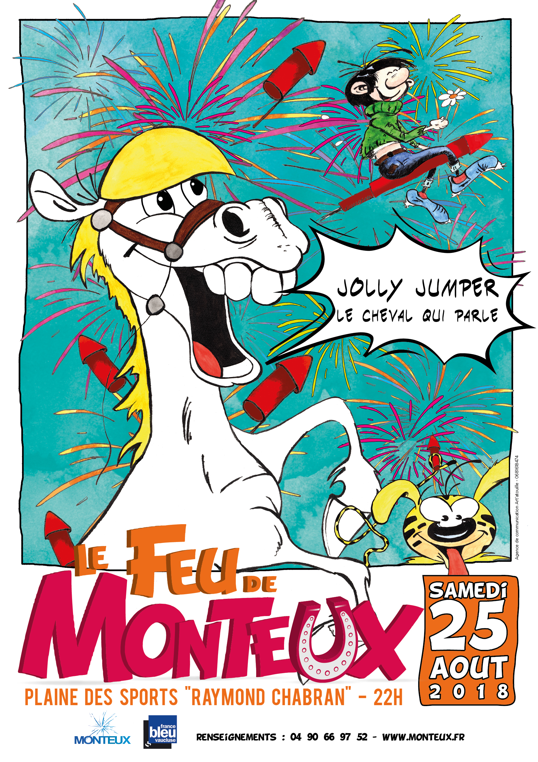 Le Feu d'artifice de Monteux 2018 "explose" dans une ambiance animée et imaginée par Christian Gros, scénariste du Feu de Monteux et Maire de la ville. Il nous plonge donc dans l’univers des personnages mythiques des Editions Dupuis : Jolly Jumper, de Gaston Lagaff, le Marsupilami,…