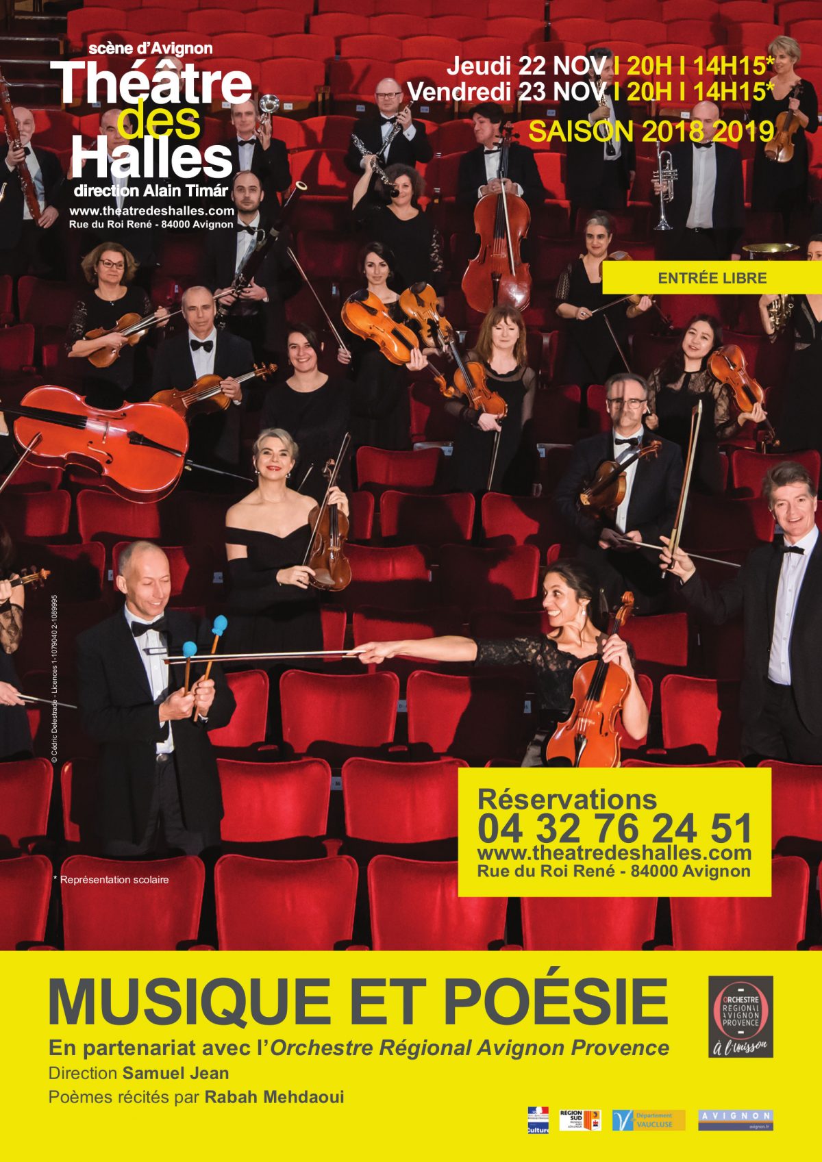 Musique et poésie, un concert proposé au Théâtre des Halles à Avignon les 22 et 23 novembre prochain sous la direction de Samuel Jean, poèmes récités par Rabah Mehdaoui.