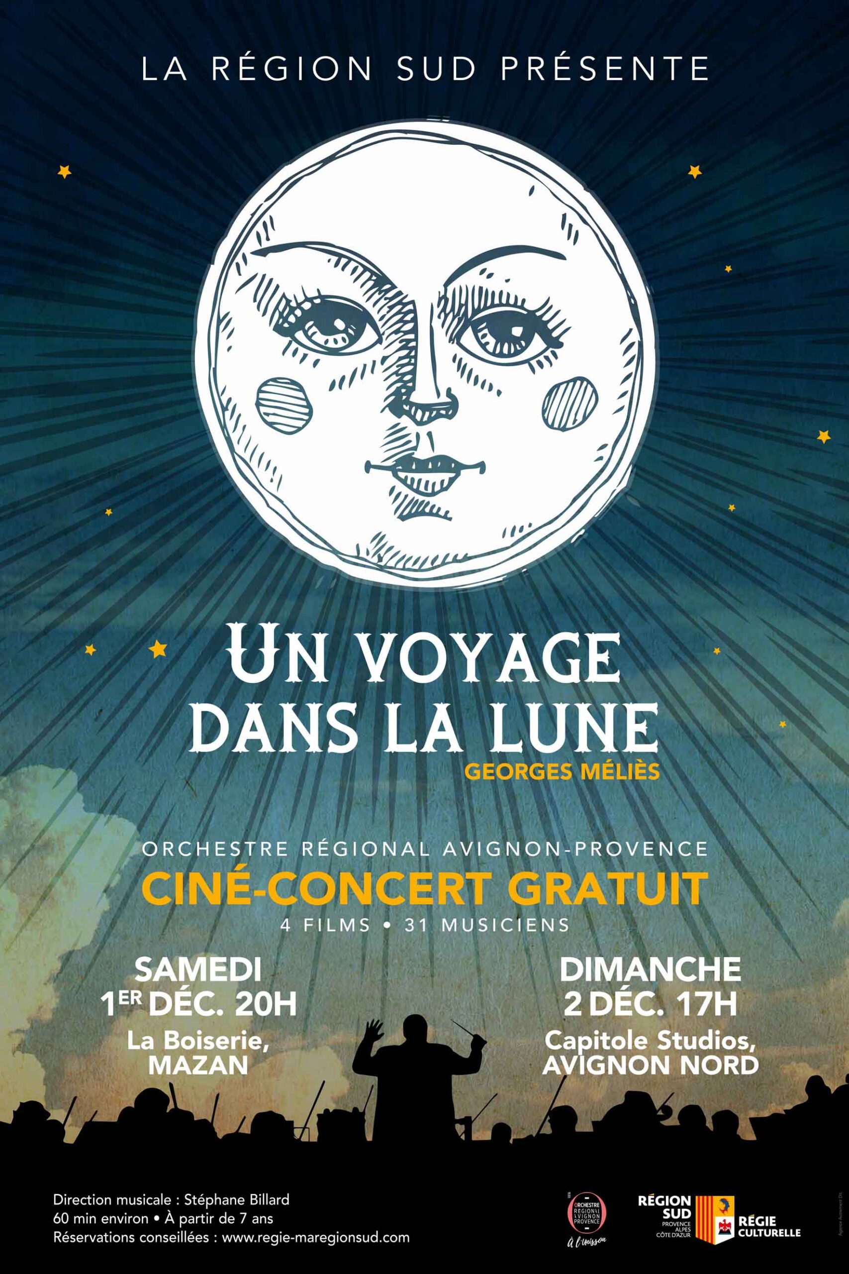 La Régie culturelle régionale et l’Orchestre Régional Avignon-Provence s’associent aux fins de démocratiser la présence d’un orchestre symphonique au sein des lieux de diffusion régionaux dans un genre inhabituel. Cette démarche, qui consiste à valoriser la richesse artistique que représente un orchestre symphonique conjuguée à l’intérêt que présente le cinéma si singulier et féérique de Georges Méliès, est une première régionale. Au-delà, c’est la promesse d’une plongée au cœur de l’histoire du cinéma et d’une expérience sensorielle inédite pour le public.