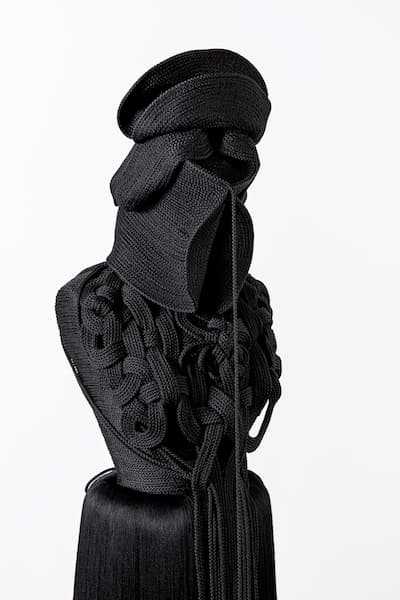« De ce tableau naît une figure mythologique dont on ne sait pas très bien la situer... on ne sait pas si ces figures mythologiques viendraient de très loin, du passé, ou au contraire du futur…Du reste, ces figures, dans les différents contextes où elles sont installées racontent, à chaque fois, une autre histoire ». « Pour moi, ici, il est question de la gestation, de création, de l’acte artistique, l’apparition de formes et de la matière, du toucher, de la question du monochrome puisque mes pièces sont également faîtes de fils et de cordes très résistantes noires, qui nourrissent en quelque sorte, mon imaginaire et le rapport singulier que j’entretiens avec les œuvres de Pierre Soulages » .