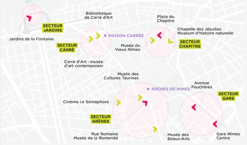 Arènes de Nîmes - Avenue Feuchères - Bibliothèque de Carré d’Art - Carré d’Art – musée d’art contemporain de Nîmes - CACN – Centre d’art contemporain de Nîmes - Cinéma Le Sémaphore - Le Spot - Les Jardins de la Fontaine - Rue Romaine et Musée de la Romanité - Chapelle des Jésuites et Muséum d'histoire naturelle - Musée des Beaux-Arts - Musée du Vieux Nîmes - Musée des Cultures Taurines - Théâtre de Nîmes
