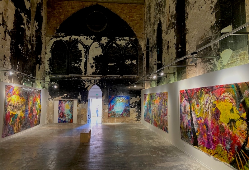 La plasticienne sculpte la matière avec des fonds posant largement les couleurs sur des reliefs contrastés. Les grands formats de l’installation puisent l’amalgame des traits dans un univers tourmenté de l’artiste. « Ma peinture cherche à s’affranchir de l’espace et du temps » explique t’elle lorsque les limbes de la mort peuvent surgir dans le regard des visiteurs.