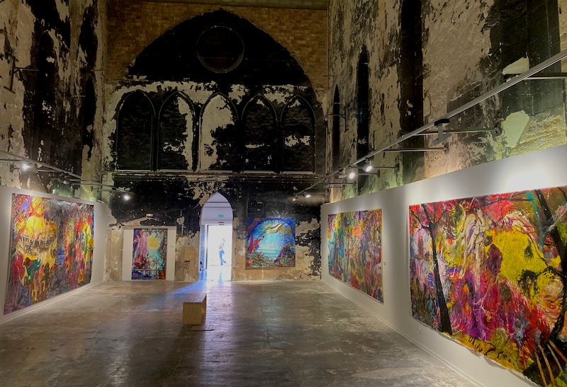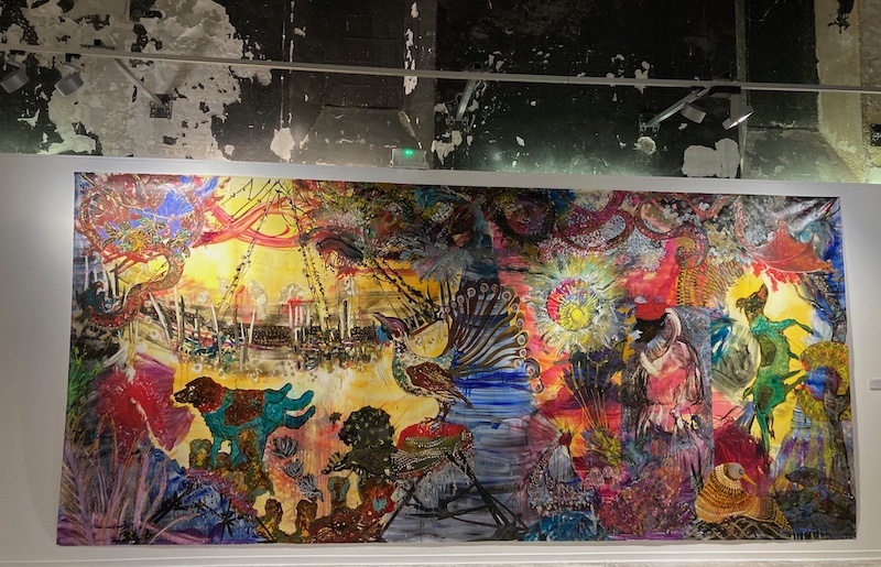 La plasticienne sculpte la matière avec des fonds posant largement les couleurs sur des reliefs contrastés. Les grands formats de l’installation puisent l’amalgame des traits dans un univers tourmenté de l’artiste. « Ma peinture cherche à s’affranchir de l’espace et du temps » explique t’elle lorsque les limbes de la mort peuvent surgir dans le regard des visiteurs.