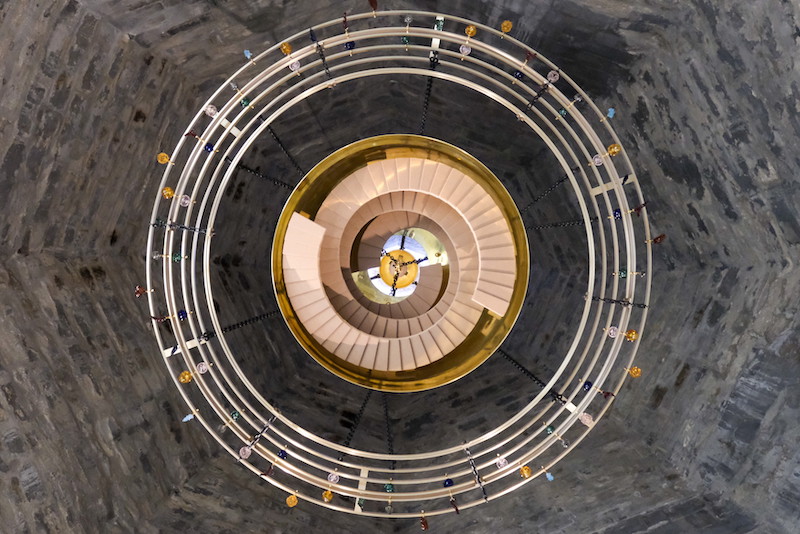 C’est dans la Cuisine Haute que le travail d’Eva Jospin sur le dehors-dedans est plus explicite. « Dans cette architecture de pierre, les murs sont identiques dedans et dehors. L’intérieur et l’extérieur du Palais est comme un gant qu’on pourrait retourner dans tous les sens ». Eva Jospin a fait ici deux œuvres avec les balcons qui sont le rappel de l’extérieur et de l’envahissement ainsi qu’une œuvre monumentale, empirique, une grande suspension profitant de la cheminée haute culminant à 22 mètres, impressionnante, mais sans obstruer la vision. Eva Jospin accompagne le lieu qui l’épaule, une sorte de dialogue dans sa quête d’art. Être portée par les espaces, épouser le lieu, être épaulé par lui est à la base de la recherche de l’artiste.