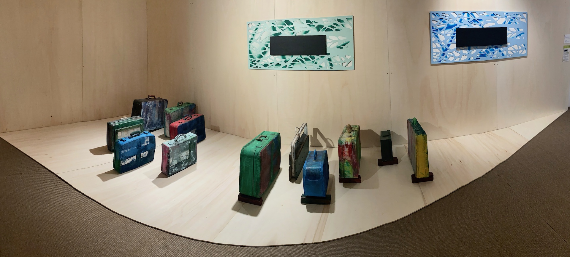 Des valises évidées équipées d’une résille auquel il applique une peinture, cette réflexion qu’il donne tient plus sur la structure de l’oeuvre que de sa mobilité. Le plasticien fait aussi référence à Marcel Duchamp. Il évoque l’éphémère mais aussi la précarité. La disposition de son travail est soigneusement pensée, Dezeuze évoque la migration, les valises vieillies le passé perdu.