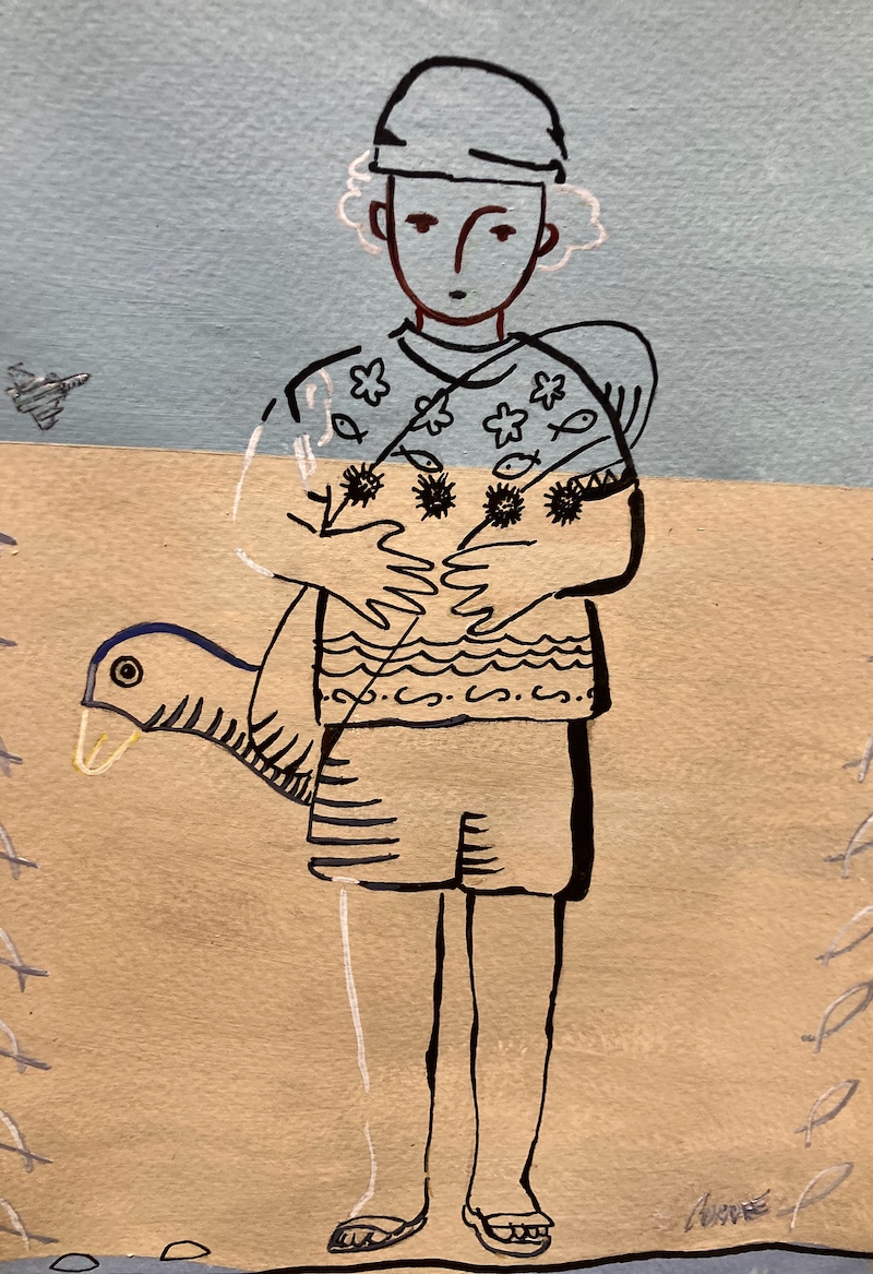 Un air de vacances sur des visuels composés de fonds en acrylique et de traits de peinture noire ou blanche… L’artiste n’est pas un inconnu, il a exposé à la médiathèque La Fabrique (Marseillan) avec un travail qui rappelle la bande dessinée et qui instruit des personnages dans leur naïveté du moment, même si l’on découvre sur son dessin un avion de chasse troublant la quiétude des lieux.