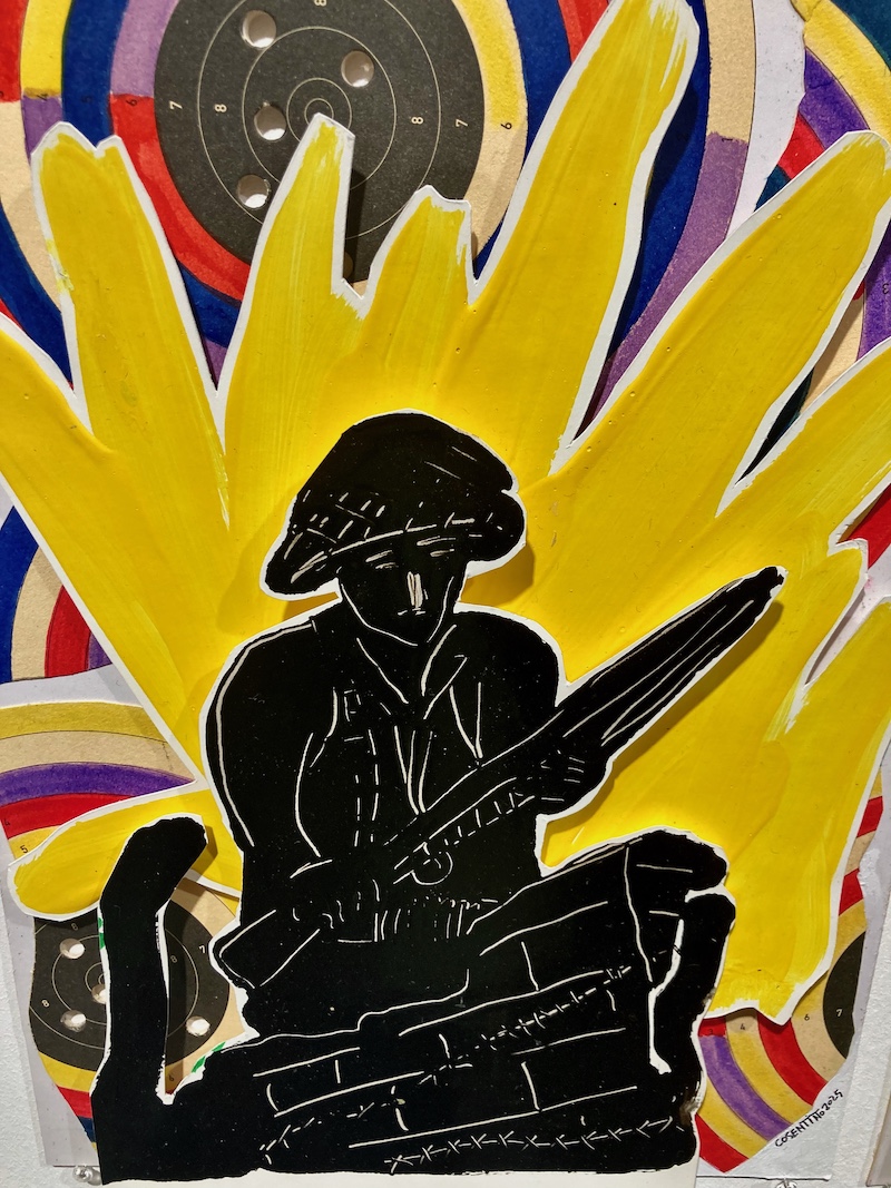Les oeuvres de Consentino font partie de l’accrochage…Le peintre Sétois bien connu dans sa ville natale a choisi d’exposer un dessin représentatif de cette liberté de peindre (mouvement de la figuration libre). On peut y voir, un hommage aux victimes du Bataclan, son oeuvre élabore au trait noir un homme muni d’un fusil d’assaut. L’artiste peu prolixe sur l’explication de son travail, formalise son art, dans un langage pictural poétique et très reconnaissable.