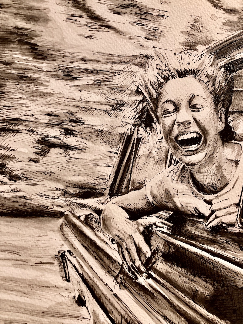 Dans ce collectif d’artistes pour les 10 ans de « Latelier », la mise au trait du dessin définit plusieurs tendances et des courants qui parfois abolissent les frontières. Le travail de Anant et de Margot intronise complètement la question du visuel dans sa représentation naïve mais également par le choix des sujets, qui est présent dans la forme la plus réelle, proche de ces dessins que l’on peut trouver dans des carnets de voyage.