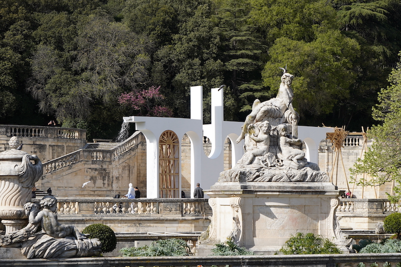 Leurs structures respectives en bois - un aqueduc par Feda Wardak, une gouttière aérienne pour Tadashi Kawanta - dessinent deux lignes aquatiques monumentales dans le paysage, en sortant l’eau de la Fontaine de son lit habituel et leur faisant vivre une aventure qui n’a rien de fonctionnelle. En effet, l’eau semble surgir d’ailleurs, dans une évocation à Nemausus, la source sacrée qui a donné le nom à la ville de Nîmes et autour de laquelle, elle fut fondée.