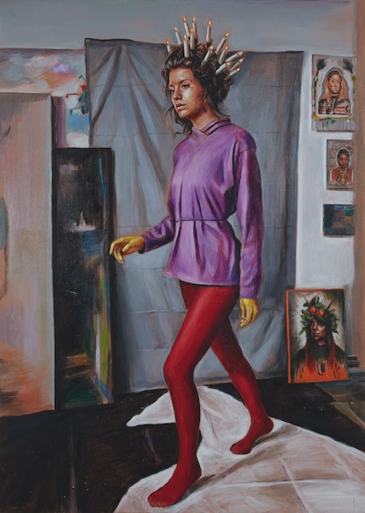 Elle est peinte et les objets qu’elle contient relèvent aussi de la peinture. Autant d’indices qui s’assemblent quand plus loin la peinture se réalise sur des étendards comme une allusion à une cérémonie processionnelle. Sur des toiles ou sur le sol, des étoffes, des boites, des représentations de tableaux et toujours l’inscription du temps, l’histoire de l’art qui se confond à celle des êtres chers. Florence Obrecht installe l’imaginaire au cœur du réel et le quotidien s’élève à la dimension d’un mythe quand les personnages empruntés à la peinture de la Renaissance revisitée par le Surréalisme sont des icônes silencieuses hors du temps.