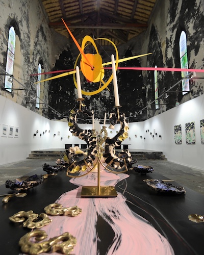 Le plasticien met en place son travail, sur la technique Raku qui trône sur une grande table attendant d’éventuels convives. Gaël Serre s’est installé au coeur de l’Ardèche pour ce retour à la terre, aux travers d’exploration d’objets, bols, chandeliers, et couverts dorés, façonnés dans un four dans un village perdu dans la montagne méridionale.