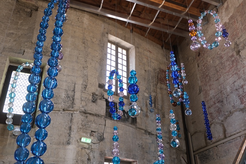 « Ici, ce sont près de 7800 perles qui sont installées et montées à la main. Pour la première fois des œuvres sont suspendues dans la plus grande salle du Palais des Papes…Les œuvres sont arrimées par un pont en acier invisible installé au-dessus de la voûte ».