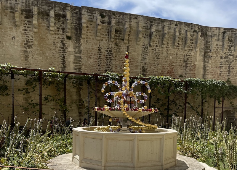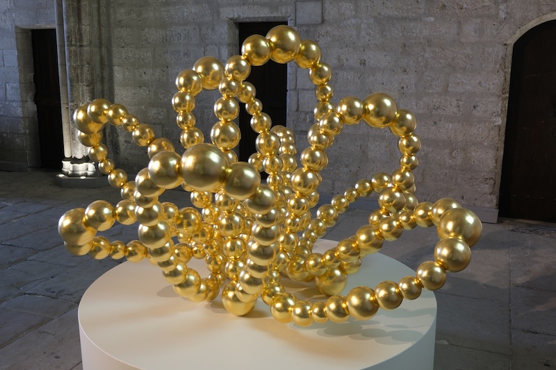 A l’aplomb de l’imposante enceinte du palais, Place du Palais, l’artiste a souhaité - en préambule présenter un « Astrolable ». Une imposante sculpture mobile, sur pied, de 10 mètres de hauteur faite de « Perles de verre » Murano soufflées créant une sorte d’enfilade d’immenses colliers entrelacés avec ses dorés, ses argentés, ses noirs s’imposant à la fortification épaisse du Palais.