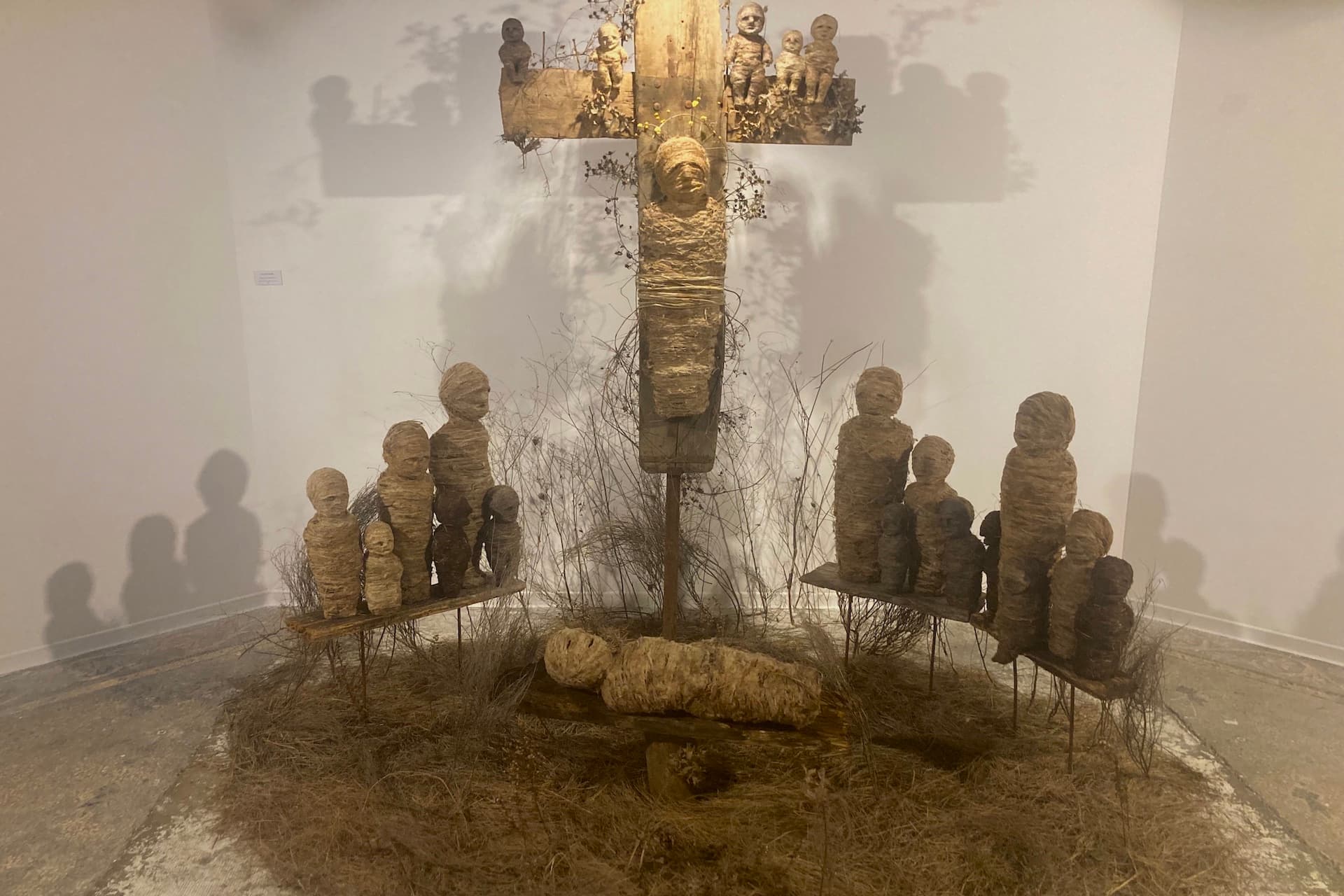 Laura Labri Laborie, Docteur des Lettres ainsi que conseillère culturelle et éditoriale, est également à l’initiative de ces accrochages collectifs. Son oeuvre « Agnus dei Agneau de Dieu » reprend le concept de la ribambelle ou chœur de villageoises. L’artiste a utilisé de la terre, du bois, des poils d’ânes, os et colle symbolisant les momies où la crucifixion intervient dans l’œuvre qui se veut mystique mais qui condamne aussi la croyance aveugle.