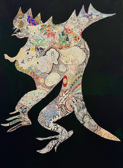 Les monstres et dragons réapparaissent dans d’autres œuvres, dont Le Dragon rouge (1964) et Monstre (1963), d’impressionnants assemblages d’objets en plastiques. Monstre (dragon), créé en 1964, reprend la forme de la bête légendaire, à travers un collage papier feutres et crayons de couleur.