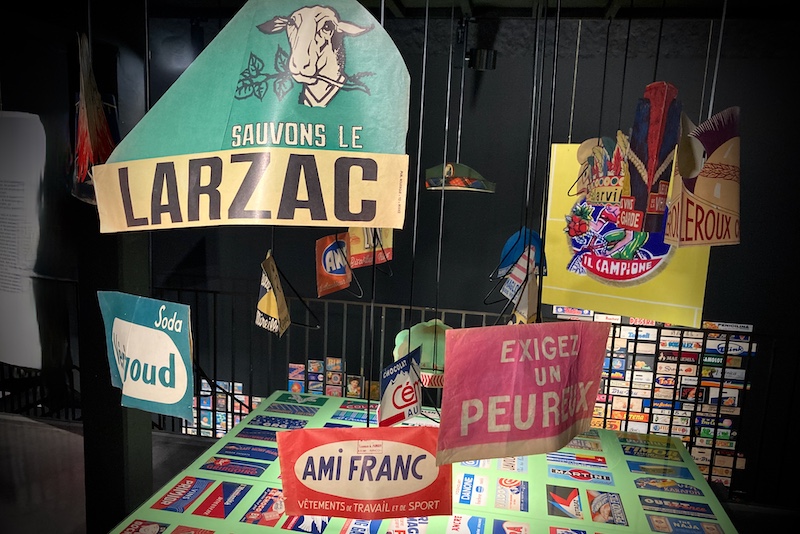 Savignac, affichiste et publicitaire a aussi sa place dans le MIAM, en même temps que les designers Madrilènes qui ont développé un vrai savoir faire sur la communication de l’orange ! Autre curiosité tous les slogans publicitaires réunis lors du passage de tour de France en 1974 au Larzac, sous la forme de chapeaux en papier ou bandeaux publicitaires.