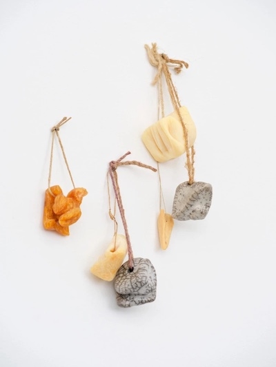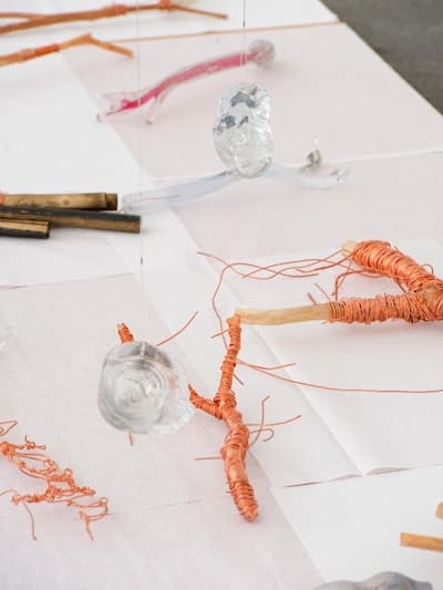 Des fragments de corps, de coquillages ou de fleurs se décèlent dans une myriade de savons décorant l’immense mur blanc de la salle ! Au sol les réalisations en verre soufflé, bois, cuivre, encre, fumée, dans un ordre aléatoire « Amygdales » évoquent la mémoire émotionnelle dans le cerveau, celui qui parfois ne délivre plus les messages que l’on attend.