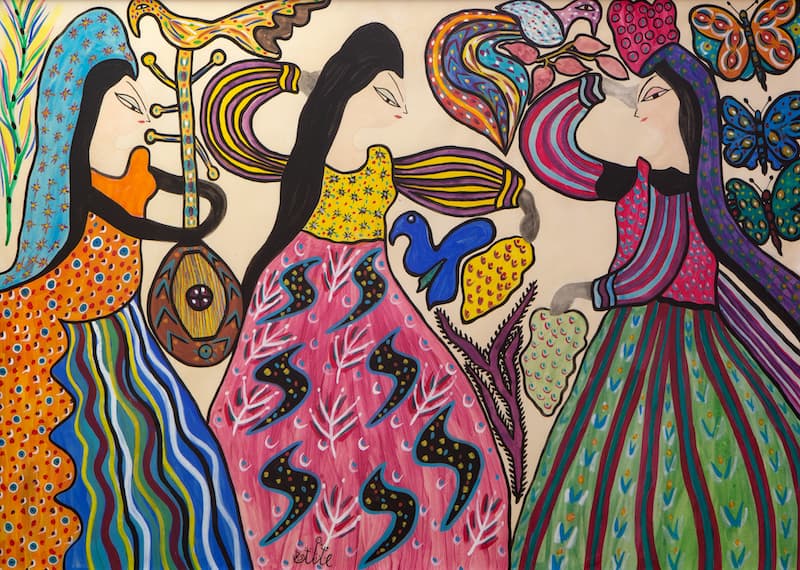 Ainsi, l’exposition débute par une évocation de la femme. Baya en remplace les mains par des fleurs, Neila Czermak Ichti les représente en boxeuses ou en catcheuses. Ici, elles mettent en commun leur amour pour la vibration des couleurs, la musique, les contes, proposant une représentation des femmes dans différents contextes et environnements, de mondes peuplés d’étranges chimères et d’animaux fantastiques.