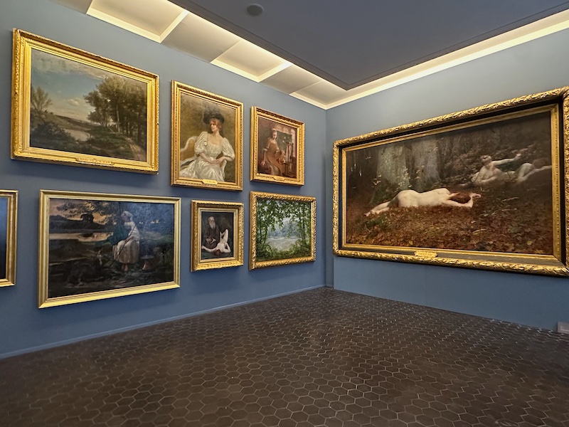 Au rez-de-chaussée commence un parcours à la scénographie particulièrement séduisante par la qualité de la présentation des œuvres dans des pièces réaménagées dans des tons bleu nuit ou bleu clair. Les dorures et les dessus de portes peints de paysages ou de scènes champêtres complètent un ensemble dévolu à la beauté, voire au luxe, rehaussé par la subtile touche contemporaine d’un sol essentiellement constitué de tomettes noires.