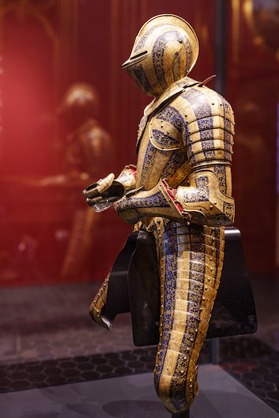 Le parcours se réalise ainsi, de découverte en découverte, au gré d’un cabinet de curiosités ou d’une salle d’apparat quand, à l’étage, on découvre un décor de papier peint dans le goût de l’exotisme chinois du XIXe siècle. Ou bien, ailleurs, des éléments en marbre d’un Mausolée ou, plus loin, l’une des pièces majeures du Musée, l’armure d’apparat de François de Montmorency parfaitement restaurée et dont l’éclat résonne avec celui d’un portrait en armure du fils du connétable de Montmorancy provenant de la galerie historique de Louis-Philippe. Sur la mezzanine, une note plus contemporaine s’ajoute par la présence d’une grande toile de Garouste et de la puissance d’une œuvre silencieuse de Djamel Tata.