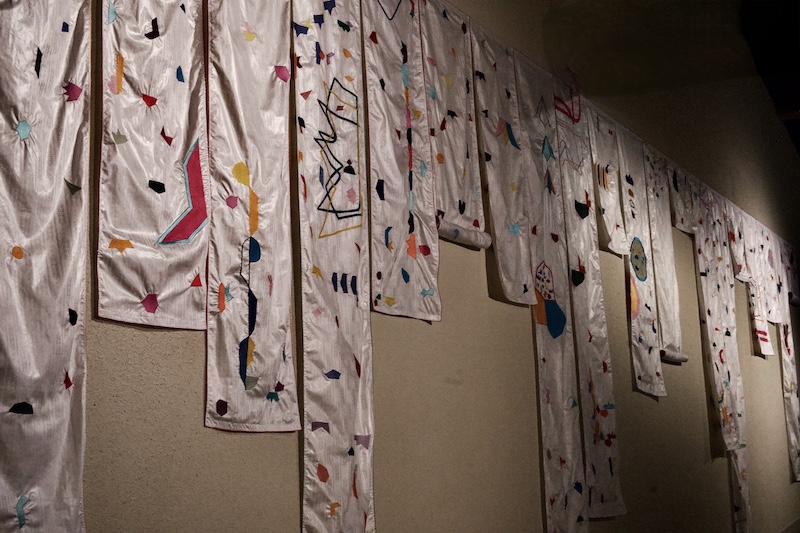 Quand on cherche à comprendre son œuvre, l’artiste répond volontiers aux questionnements : « Dans mon travail, j’explore donc différentes formes de relation entre artistes et artisans ». La vénération est l’une des pistes de cette exploration de l’objet, divinité ou fonctionnel. Les grands formats en forme de bannières couvrent le grand mur du musée comme des épitaphes sur tissus, engendrant un dialogue intime, voire secret, entre le monde des disparus et celui des vivants.