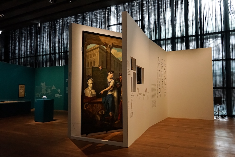 Le tableau monumental d’Alexandre Véron-Bellecourt datant de 1802 ouvre l’exposition. La Muse de l'Histoire, Clio, apprend l’histoire aux peuples du monde en rappelant les hauts faits de Napoléon, avec, en arrière-plan, le musée du Louvre qui se veut être, depuis 1794, le conservatoire de cette grande histoire universelle écrite par la France et l’Europe. Ce tableau illustre notre manière de voir l’histoire jusqu’à la fin du 20e siècle en France et dans tout le monde occidental.