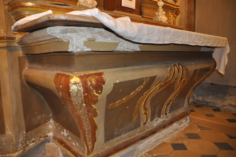 Beaucoup de Trompe-l’œil dans cette église. Cette restauration va faire redécouvrir l’église telle qu’elle était au 18e siècle. Des retables ont été peints qui retrouveront leur splendeur première. On va redécouvrir une vision du fait religieux (peindre en orange au lieu de noir), de pratiques religieuses que l’on a perdues à travers ces couches de peinture qui se sont rajoutées sur ces retables. C’est passionnant. Vision et perception des couleurs de l’époque, histoire des couleurs… »