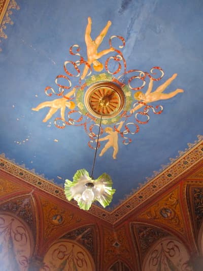Fanny Rogolini : Les styles, les influences, de même que les symboles des œuvres de Patrizio Rogolini sont multiples, à la fois la Grèce, Rome, l’art gothique et ses ogives, la Renaissance italienne, avec Mantegna dont il a reproduit le Christ gisant,et les prémices de la peinture du XXème siècle, l’Impressionnisme et même des tableaux plus modernes, j’allais dire d’avant-garde pour l’époque… Les architectes des bâtiments de France lorsqu’ils sont venus chez moi m’ont dit « Votre grand-père dans cette maison a déposé tout son savoir-faire, c’est un tout, permettez-moi d’employer une expression un peu grossière, madame Rogolini, votre grand-père s’est « lâché » à la Villa Juturne où il a exposé l’ampleur de ses connaissances ». On peut penser par ailleurs que c’était un « bon vivant » preuve en est cette belle jeune femme Primavera qui apparaît à la porte de sa chambre…. Il y a un côté très païen dans le travail de mon grand-père avec Bacchus très présent, tous les arts la musique, le théâtre, l’astronomie, les éléments et des Naïades nues Il ne faut pas oublier que dans sa jeunesse il a vécu à Paris, donc il a dû fréquenter le milieu artistique de son temps, d’ailleurs à propos de modernité, mon père et ma tante sont des enfants naturels, reconnus par leur père et leur mère qui n’étaient pas mariés… Ce grand-père faisait preuve d’avant-garde même vis-à-vis du mariage… Il faut se souvenir que le milieu artistique au début du XXème siècle à Paris était engagé avec une ouverture de pensée politique aussi…