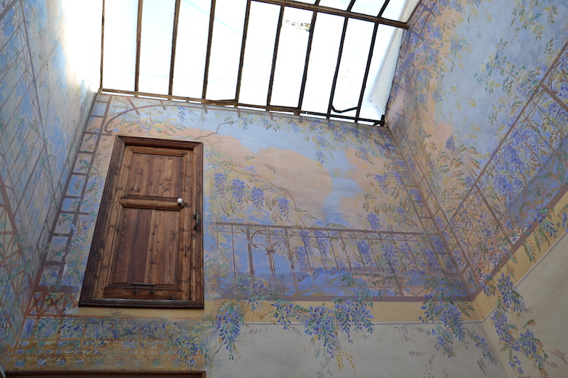 Fanny Rogolini : On part d’abord de la double entrée de la villa où l’on découvre la représentation de la symbolique de l’eau, de la méditerrannée, et la représentation de la légende d’Icare ,et de Juturne. On se trouve alors au pied de la cage d’escalier, nous sommes fin XIXème siècle début XXème siècle, la penture florale illustre étage après étage les quatre saisons qui conduisent au Paradis : les combles : la porte est la porte du Paradis en quelque sorte… Enfants avec nos cousins nous aimions grimper dans les combles par une échelle, nous nous amusions beaucoup à la Villa Juturne c’était aussi un paradis pour nous. Au dernier étage on perçoit le mouvement du vent dans les fleurs comme l’ont souligné les architectes des Bâtiments de France. Au sous-sol il y avait l’atelier de mon grand-père qui donnait sur le jardin avec ses mandariniers, ses citronniers...