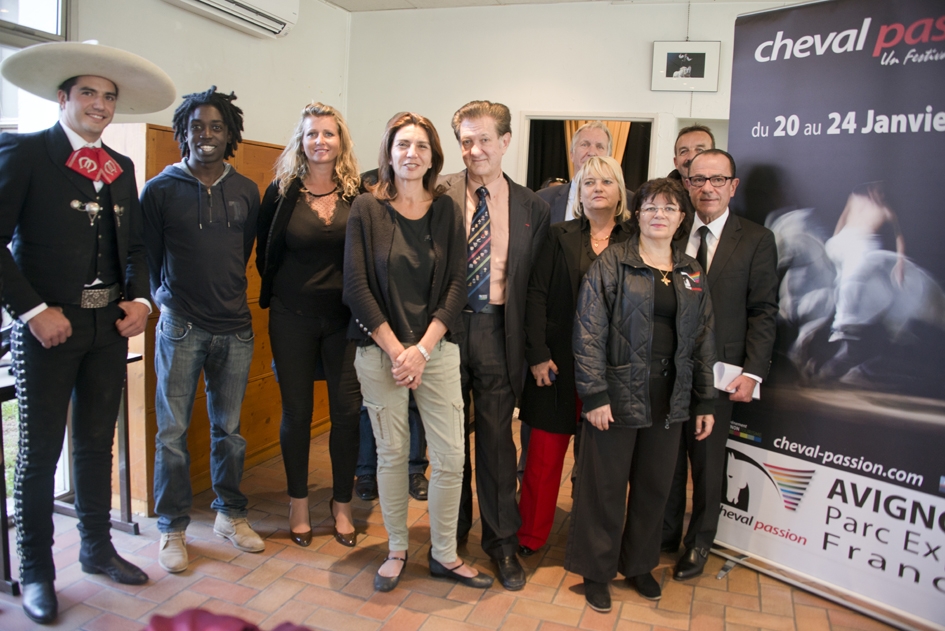 Autour des membres d'organisation de Cheval Passion et des élus, la présidente Dominique Mejean a présenté la nouvelle édition de Cheval Passion, accentuée cette année sur les rencontres internationales. Du Mexique à la Russie, de la Camargue au Portugal, de Sienne aux Saintes-Maries de la Mer, c'est un tour du Monde en cinq jours, en balade à cheval !