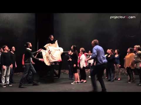 Le metteur en scène Fréderic Belier-Garcia (en chemise de couleur bleue) guide Zuzana Markovà, dans ses gestes et son interprétation pour être au mieux la Lucia qu'il imagine, assisté de Caroline Gonce.