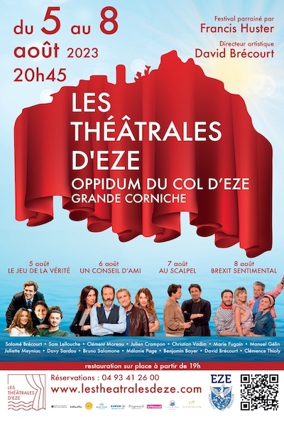 Du 5 au 8 août, quatre pièces de théâtre contemporaines pour rire, pleurer et réfléchir, choisies pour cette première édition des théâtrales d’Eze, par le directeur artistique David Brécourt, amoureux du village d’Eze, comédien et directeur de théâtre, sous le regard passionné de Francis Huster, parrain du festival.