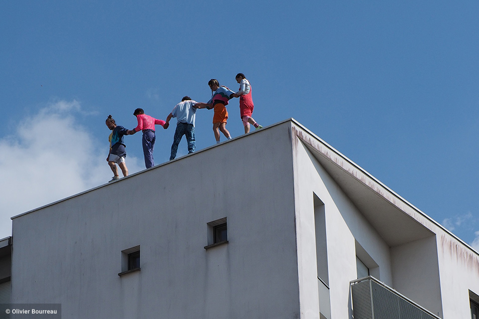 ‘Impact d’une course X stadium’ est un spectacle in situ déambulatoire avec des portés, de l’escalade, des passages en hauteur sur les toits et de la musique électronique en live. Une balade guidée par sept acrobates et deux musiciens. Le collectif salue tous les habitants du monde en abordant la ville autrement qu’en ce pourquoi elle a été prévue.